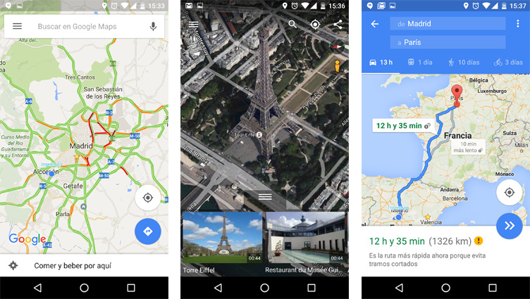 • Google Maps, Navigator, Street View y Google Earth: El conjunto de aplicaciones de Google para «navegar» por el mundo desde el teléfono es quizás el más potente de todos. El sistema de navegación va mejorando por momentos, incorporando información del trafico en tiempo real y recalculando las rutas sobre la marcha. El Street View nos ayudará a saber que nos vamos a encontrar cuando lleguemos a nuestro destino, y la vistas satélite… me paso horas viendo el mundo a vista de pajaro…  El problema es que para la mayoría de estas funciones hay que tener conexion, y en algunos casos el consumo de datos es elevado. Un truco es cargar un área en el mapa cuando tengamos Wifi, y así se quedará almacenado en caché para poder consultarlo sin conexión.